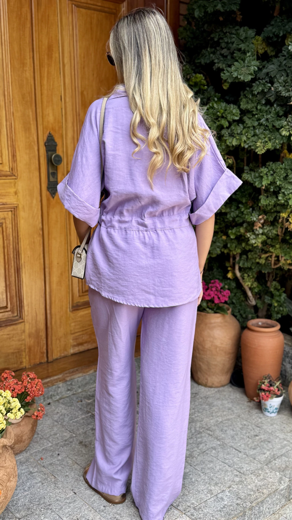 Conjunto em tecido sensoriale na cor lilás , composto por calça e blusa. Elegante e moderno, é a escolha ideal para compor looks casuais com um toque sofisticado.