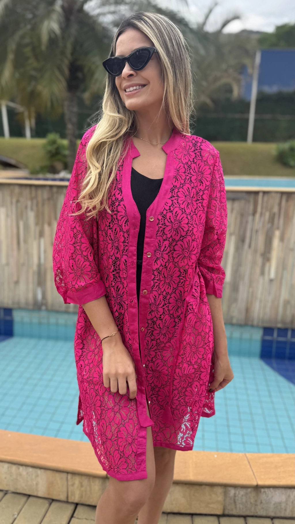 Versátil e cheia de estilo, confeccionada em renda floral na cor pink. Modelo chemise, pode ser usada aberta ou fechada, com manga mais longa ou mais curta. Possui cordão para ajuste na cintura.