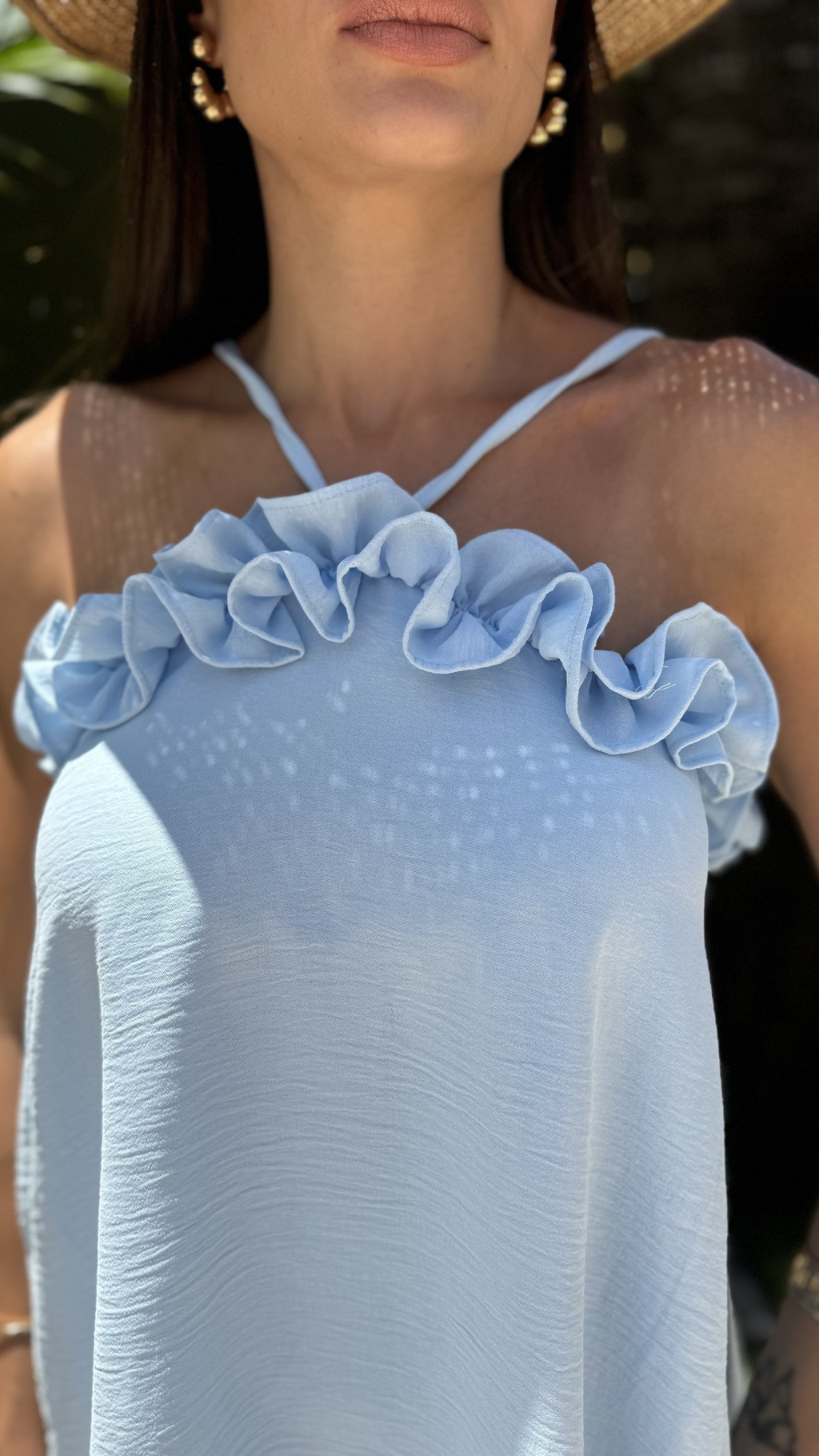 Regulagem na alcinha e detalhe babado franzido na parte superior.