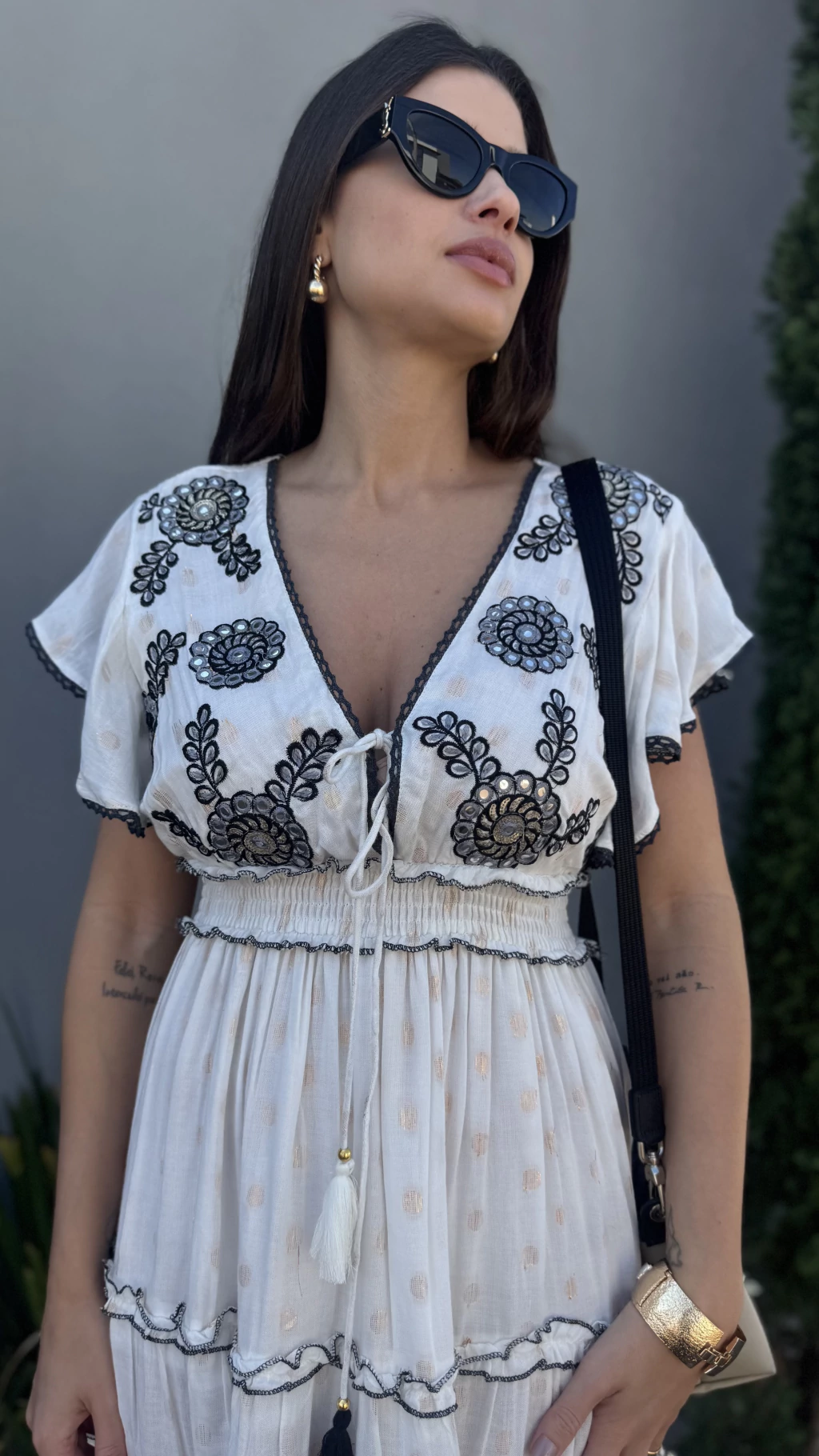 Vestido curto boho chic branco com fios dourados repleto de bordados no busto