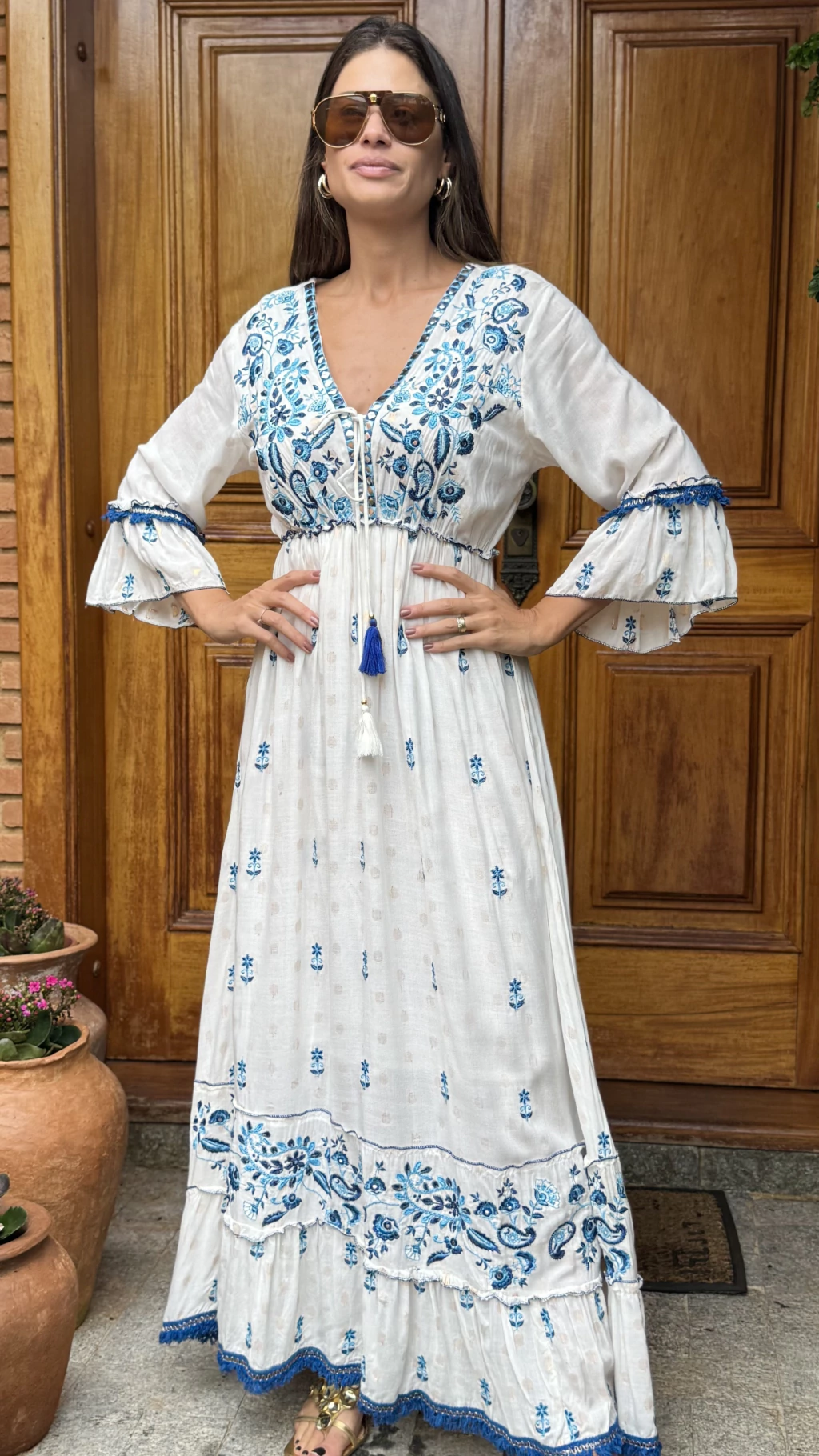 Vestido boho chic nas cores azul e branco, cordões para amarração nas mangas, rico em detalhes com bordados em azul, com detalhes em dourado. Uma peça elegante, leve e confortável.