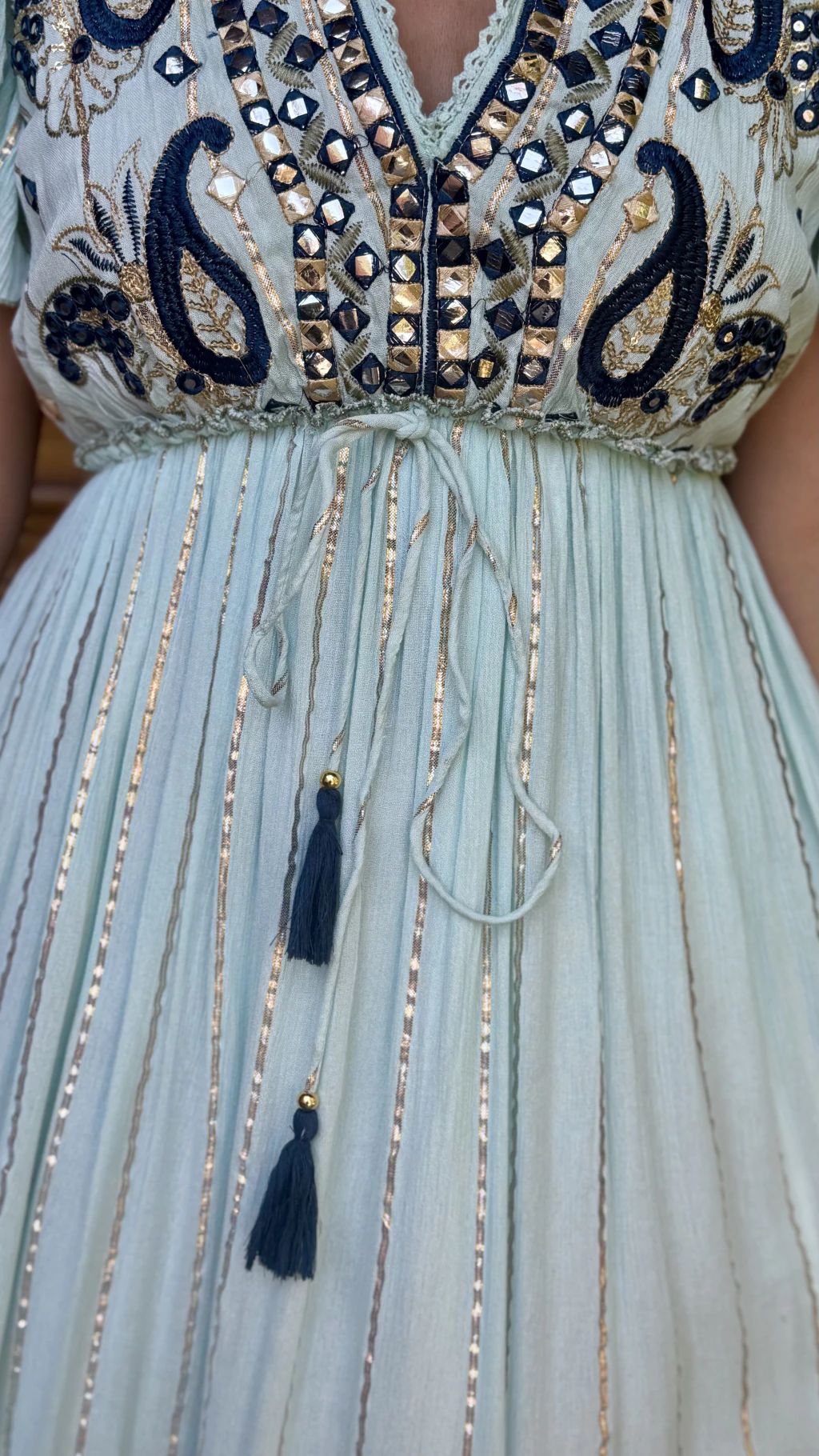 Vestido longo boho chic azul com fios dourados repleto de aplicações e bordados no busto e barra . Seu babado nas mangas é seu charme! Uma peça elegante, linda e fresquinha. Possui amarração em cordão com tassel nas costas e cintura