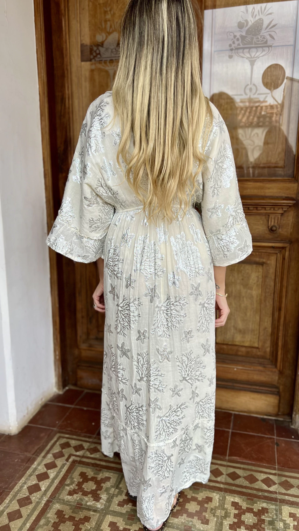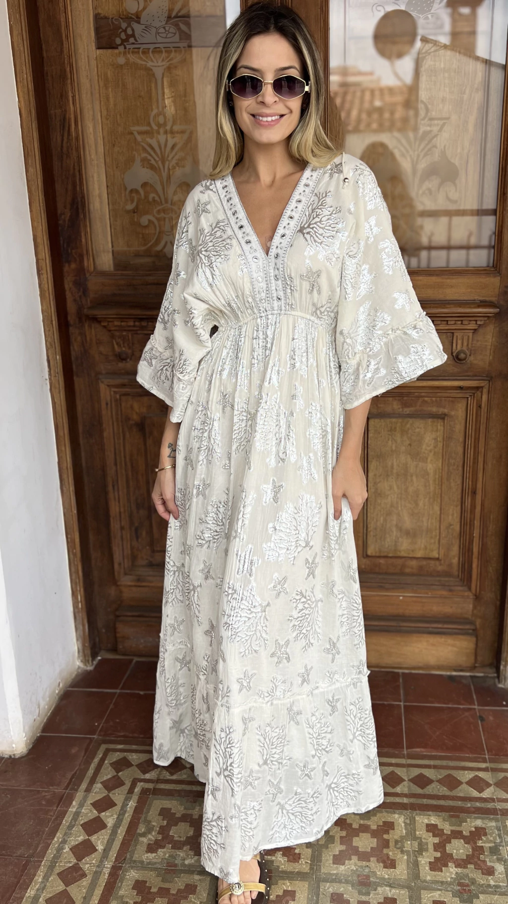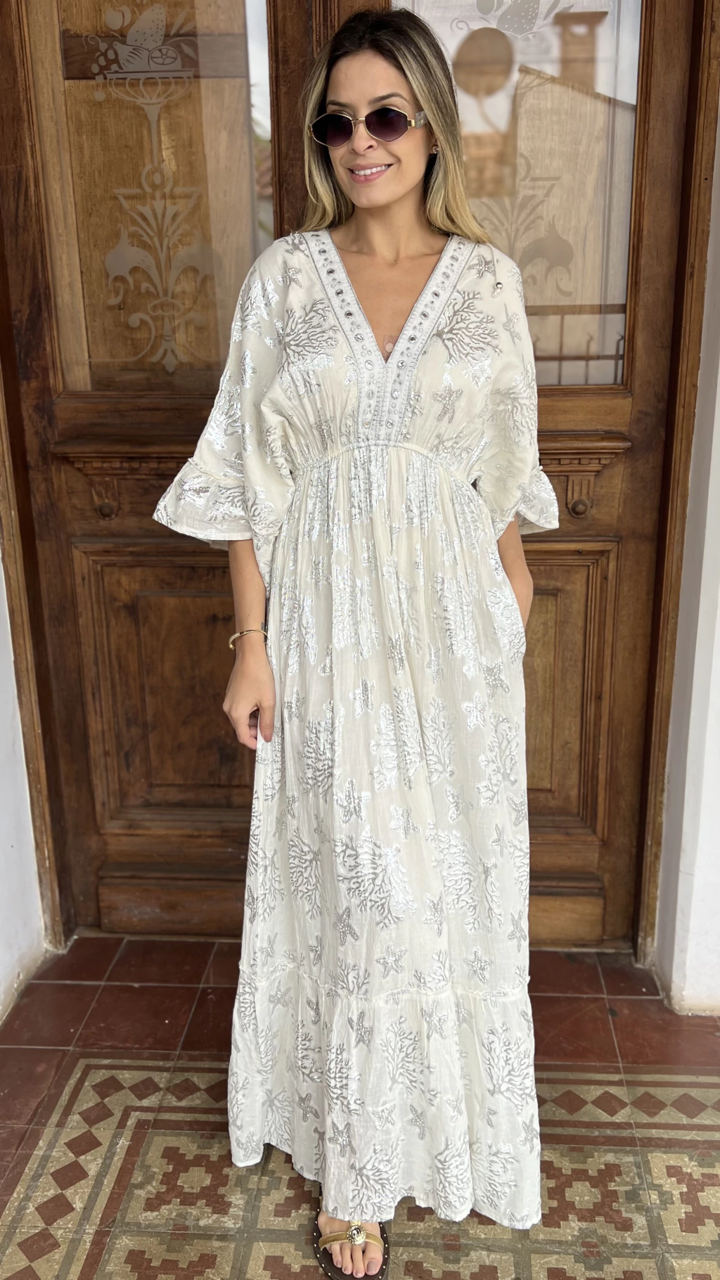 Vestido longo branco com delicados desenhos prateados inspirados no fundo do mar. Conta com elástico abaixo do busto para melhor ajuste e cordão que amarra nas costas, garantindo um caimento leve e sofisticado.