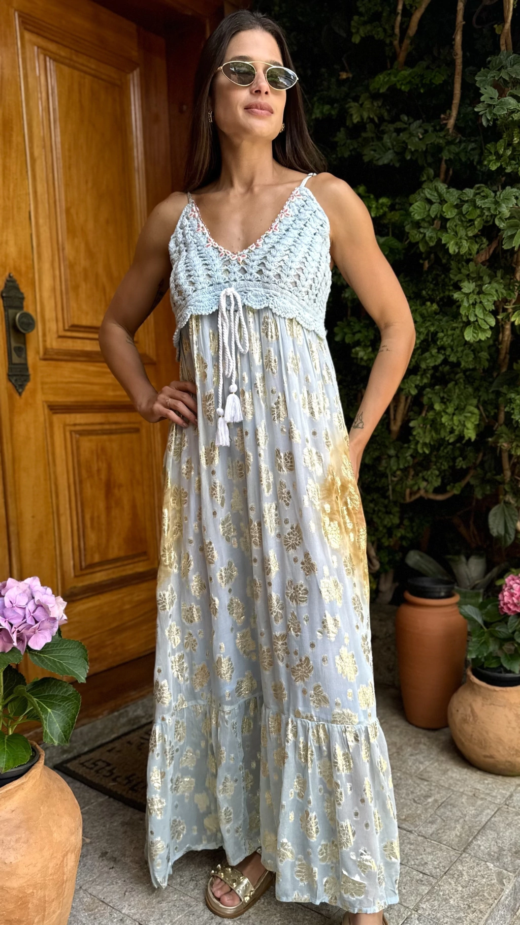Vestido boho premium em voil com bordados dourado. Parte superior em malharia estilo croche. Mistura de materiais e detalhes incríveis, , cordão e estampa com fios dourados. Pedraria e bordados magníficos.